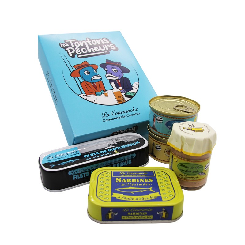 Découvrez notre coffret "Les Tontons Pêcheurs", qui regroupe une sélection de nos délicieuses spécialités à base de poissons. Vous y trouverez des filets de maquereaux au vin blanc, des sardines à l'huile d'olive biologique, des rillettes de thon aux fines herbes, une crème de sardines au whisky, et nos savoureuses rillettes de maquereaux. C'est le cadeau parfait à offrir ou à s'offrir pour les amateurs de saveurs marines.